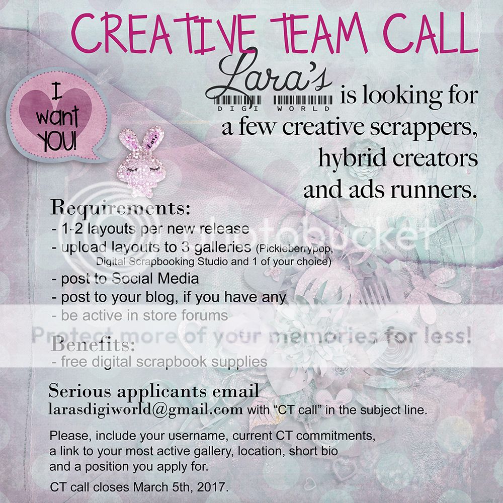 Serious applicants email larasdigiworld at gmail dot com with "CT call" in the subject line. Please, include your username, current CT commitments, a link to your most active gallery, location, short bio and a position you apply for.