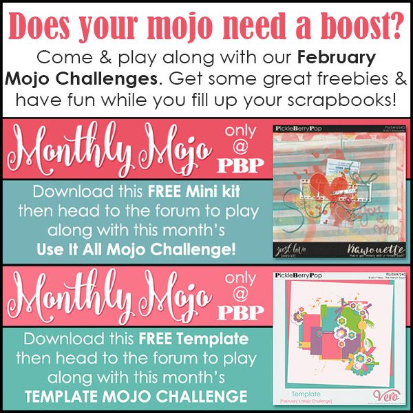 Come and play along with Pickleberrypop's February Mojo Challenges. Get some great freebies and have fun while you fill up your scrapbooks!